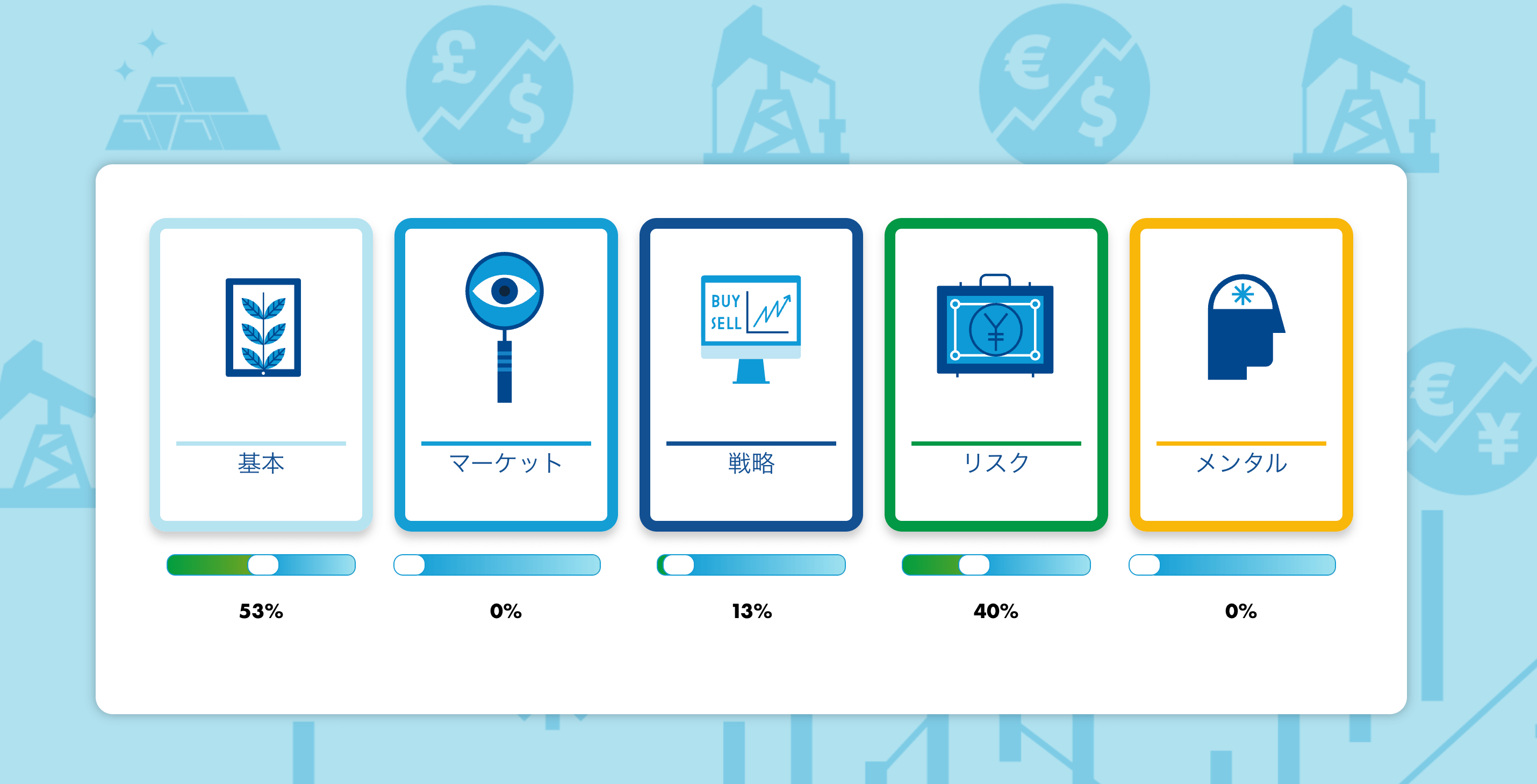 トレードに関する知識が5つの項目に分類されています。既に知っている知識も、確認クイズを行うことで理解度の再確認ができます。トレードで安定して稼ぐためには専門知識が必須です。トレード歴が何年であっても知識に漏れがないか、チェックしてみましょう。また、このページから弊社発行の本をPDFで読むこともできます。